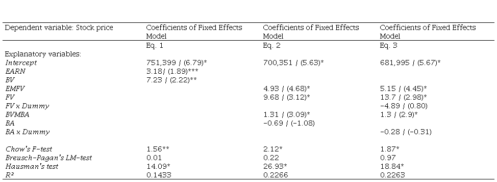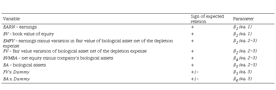 Where EMFV corresponds to the earnings minus the fair value variation of the biological assets[4] of the company i in year t, net of the depletion expense; FV corresponds to the fair value variation of the biological assets of the company i in year t, net of the depletion expense; BVMBA corresponds to the book value of equity minus the biological assets of the company i in year t; BA corresponds to the biological assets of the company i in year t; and Ɛ is the random error. The variables EARN and BV were decomposed, respectively, into EMFV and FV, and BVMBA and BA.