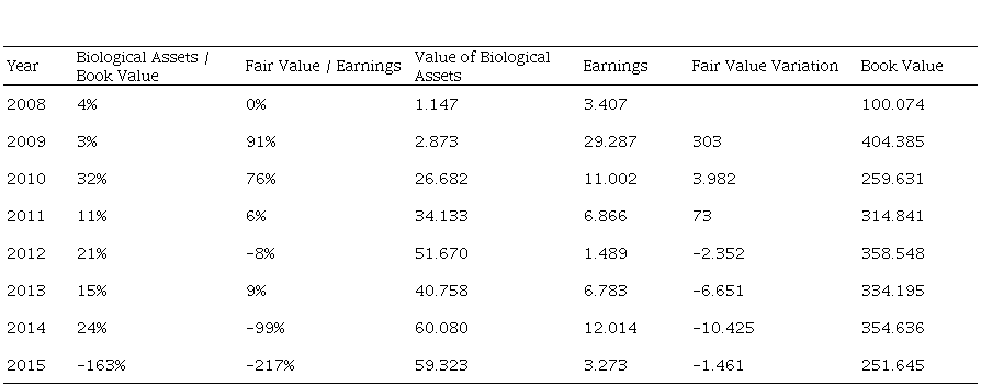 To analyze the timeliness of the fair value of the biological assets, the earnings were decomposed into earnings minus the variation in the fair value of the biological assets net of the depletion expense (EMFV) and the variation in the fair value of the biological assets net of the depletion expense (FV).