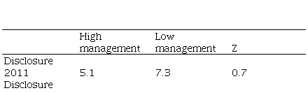 The first comparison was made between the discretionary accruals, which represent evidence of earnings management, and the disclosure score obtained from section 3.1 ‘Disclosure in the Notes to the Financial Statements’. Therefore, the companies were ranked according to their discretionary accruals. Next, the medians for the first and fourth quartiles were calculated. Then, we did the Mann-Whitney test to verify whether these medians are statistically different. According to Fávero et al. (2009), this is one of the most powerful non-parametric tests for two independent samples. The null hypothesis of the test affirms that there is no difference between the groups. The results were used to assess research hypothesis 5.