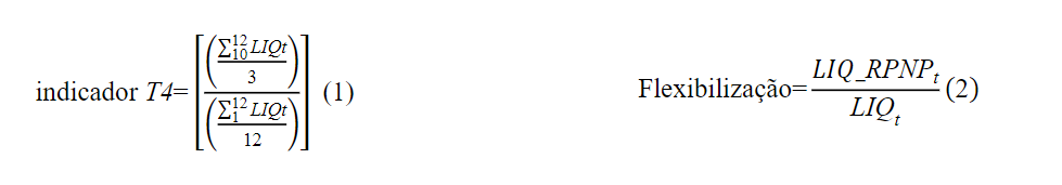 O indicador T4 (1) consiste na divisão da média de gastos de determinada categoria econômica do quarto trimestre de um exercício financeiro (t) pela sua média anual. Já o indicador de flexibilização (2) consiste na divisão de gastos empenhados e não liquidados, que têm o implemento da condição contratual em exercício financeiro subsequente (t) ao da autorização (t-1;...;t-n) como proporção de gastos de mesma natureza que são liquidados no mesmo ano da autorização orçamentária.