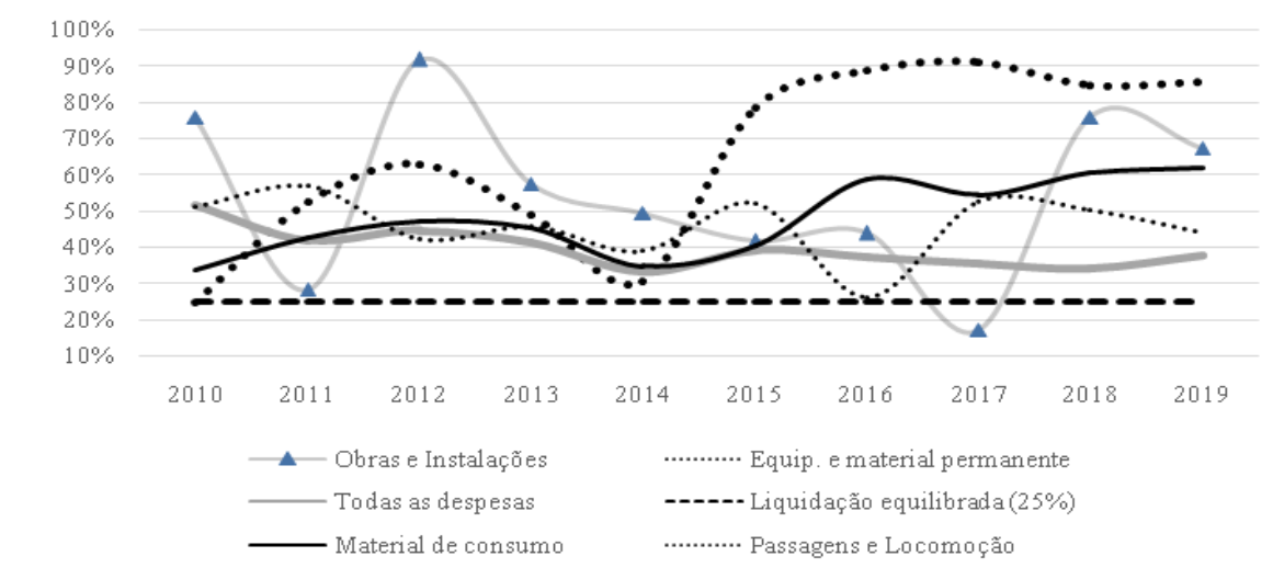 A Figura 3 apresenta o índice T4 entre 2010 e 2019 das principais despesas discricionárias que se destacam na série. Os dados revelam que, de um modo geral, a despesa é executada principalmente no último trimestre. Apenas uma ocorrência (obras e instalações, em 2017) foi registrada com menos de 25% da liquidação anual. Considerando que esse limite corresponde a um quarto do gasto, a extrapolação dessa fronteira implica em acumulação acima da média aritmética de uma execução uniformemente distribuída ao longo do ano. Os materiais de consumo, por exemplo, alcançam 62% de acumulação no final de 2019 e os materiais permanentes lideram a acumulação de gastos de final de ano com percentuais acima dos 78% no último quinquênio.