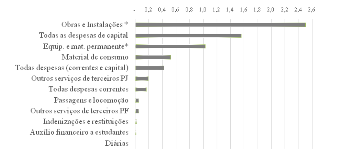 O indicador de flexibilização (Figura 2) permitiu verificar a proporção de restos a pagar não processados liquidados (autorizados antes do ano corrente) sobre a liquidação de gastos autorizados no ano corrente. Conforme a Figura 4 percebe-se que os gastos de capital são os que mais se sujeitam a esse mecanismo de transporte orçamentário, com montantes consideráveis que excedem à anualidade: os gastos com obras e instalações, por exemplo, são 2,5 vezes mais liquidados fora da anualidade orçamentária, que seria entre 1º de janeiro e 31 de dezembro do ano da sua autorização. Mais da metade das despesas com equipamento e material permanente não chega a ser realizada dentro do exercício em que o crédito foi autorizado e distribuído e mais de 30% dos materiais adquiridos para consumo também têm sua execução orçamentária adiada. Via de regra, algumas despesas de custeio (restituições, auxílio financeiro, passagens e diárias) não deveriam ter a execução anual flexibilizada, uma vez que não há pressupostos que justifiquem a sua inscrição em restos a pagar, como ocorre no caso de atraso na entrega de mercadorias ou atraso na execução e conclusão dos serviços.