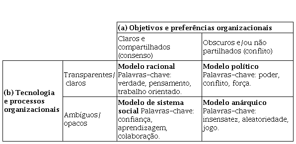 Por fim, o modelo anárquico ocorre quando as metas são conflitantes e os meios para alcançá-las, incertos. Trata-se um modelo de sistema aberto, não linear, que rotineiramente confronta objetivos problemáticos, sem uma tecnologia definida e participação fluida dos seus membros no processo de tomada de decisão (Kocatürk & Karadağ, 2021). Esse modelo também é descrito pela metáfora da “lata de lixo”, onde os problemas e soluções seriam mexidos e remexidos até que se encontrem em um processo decisório desencadeando uma ação organizacional (Deleon, 2010). Sob certas circunstâncias, um sistema anárquico de tomada de decisões pode apresentar desempenho superior a outros à medida que a complexidade da decisão aumenta (Ma et al., 2019). Para Kocatürk & Karadağ (2021), é o líder anárquico quem deve entender o significado dos acontecimentos e da cultura da organização e oferecer soluções alternativas para os problemas.