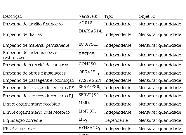 De forma complementar, utilizou-se uma regressão linear múltipla (OLS) para testar em que medida a acumulação de gastos pode ser influenciada pela decisão do gestor. Desse modo e com base em relatórios preliminares, um conjunto de variáveis foi definido (Tabela 1).