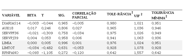 No teste com as variáveis independentes, a análise de regressão resultou um modelo estatisticamente significativo para a acumulação de gastos [F (5,84) = 26,928; p<0,001; r2 = 0,616]. A acumulação dos empenhos, principalmente de obras, instalações e materiais (permanente e consumo), foi previsora da acumulação de gastos no final de ano.