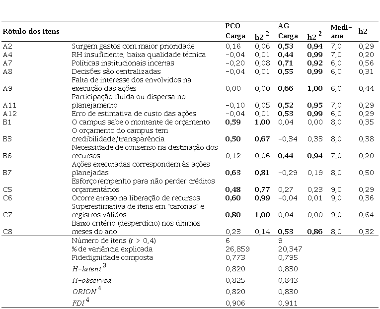 Na interpretação dos fatores, é importante destacar que as variáveis com cargas mais altas são consideradas mais importantes e têm maior influência sobre o rótulo definido (Hair Jr. et al., 2009). Nesse sentido, o Fator 1 foi denominado "Proteção ao Crédito Orçamentário" (PCO) e explica 26,8% do constructo. Já o Fator 2 recebeu o título de "Apatia Generalizada" (AG) e explica 20,3% do constructo.