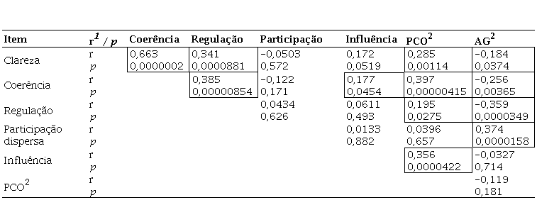 (1) r = coeficiente de correlação de Spearman. (2) Dimensões PCO – Proteção ao Crédito Orçamentário e AG – Apatia Generalizada, que levam em conta os escores fatoriais obtidos através da análise fatorial exploratória.