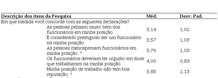 A Tabela 7 demonstra uma alta percepção de prestígio por parte dos contadores públicos. Os respondentes afirmaram ter orgulho de sua atual posição profissional e que a sua atual posição é considerada prestigiosa pelos demais colegas. A média das respostas na escala foi de 3,67, com desvio padrão de 0,66.