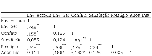 Ainda em relação à variável envolvimento social, a mesma também apresentou correlação positiva e significante com as variáveis conflito de papéis (0,158, com p < 0,05) e prestígio profissional (0,248, com p < 0,01), tais dados indicam que, considerando a amostra coletada, contadores que se envolvem no processo de accountability tendem a possuir maiores níveis de conflitos de função no exercício da mesma, porém possuem maior prestígio dentro de seu contexto organizacional.