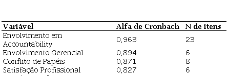 Para avaliar o nível de confiança das respostas obtidas foi utilizado o teste conhecido como Alfa de Cronbach. O referido teste mede a correlação existente entre os itens de um determinado instrumento de coleta (Almeida et al., 2010). Os resultados obtidos de todas as variáveis utilizadas nesse estudo estão expressos na tabela a seguir.