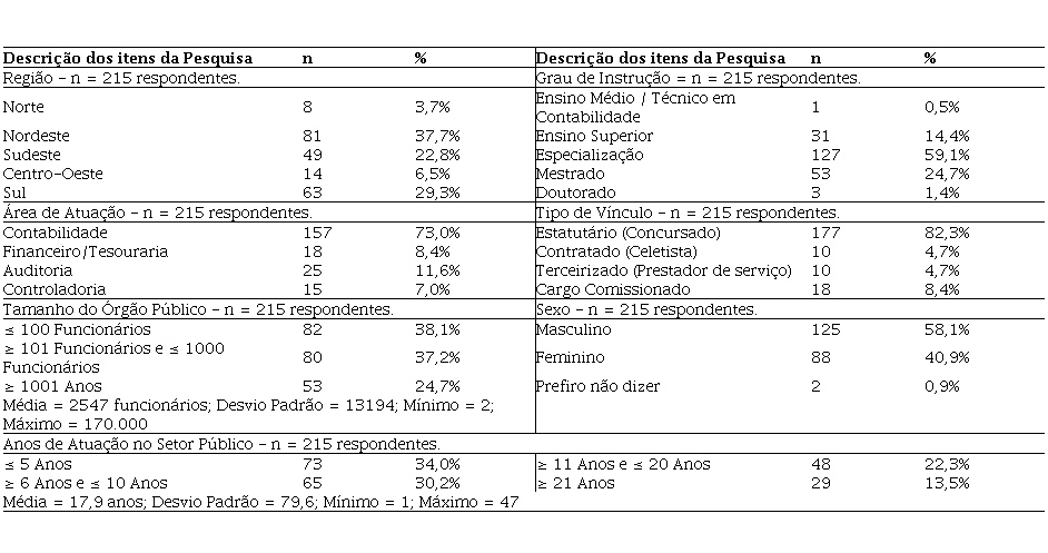 Aproximadamente 1.500 profissionais contábeis foram contatados no período de agosto a novembro de 2020 e foram obtidas 217 respostas. No entanto, 215 respostas foram qualificadas para este estudo, pois dois dos profissionais que responderam ao questionário eram, respectivamente, professor de uma instituição de ensino superior pública e empregado de uma empresa privada. Dessa forma, a taxa de resposta obtida por esta pesquisa foi de cerca de 14,50%.