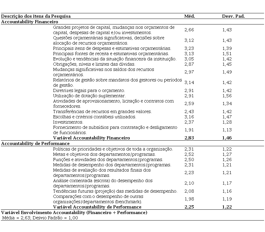 No que se refere ao Accountability de Performance, a participação é ainda menor, com média das respostas na escala de 2,25 e o desvio padrão de 1,22. Neste item destaca-se a baixa atuação dos respondentes na divulgação de projeções de desempenho da instituição e um maior envolvimento na divulgação das metas da organização das atividades que elas desenvolvem. Por fim, com base na mensuração do envolvimento dos contadores pesquisados nos dois aspectos do Accountability, é possível construir a variável “Envolvimento em Accountability” dos contadores públicos. Esta variável possui média de 2,63, desvio padrão de 1,00.