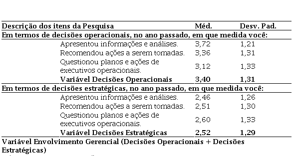 Assim, os resultados obtidos na Tabela 4, referentes ao envolvimento gerencial dos contadores públicos, indicam que estes estão mais envolvidos em decisões em nível operacional do que em nível estratégico (média de 3,4 e 2,5, respectivamente), resultado diferente do encontrado por Frazão e Wanderley (2021). Nos achados de seu estudo, realizado com empresários contábeis brasileiros, os autores mostram que apesar do maior envolvimento dos contadores com decisões operacionais, os mesmos apresentam um envolvimento semelhante em decisões estratégicas (média de 3,63 e 3,25, respectivamente) (Frazão & Wanderley, 2021). A análise comparativa entre os resultados obtidos no presente estudo e no estudo de Frazão e Wanderley (2021) indica que, se tratando das amostras obtidas em ambos, os contadores privados apresentam maior envolvimento em decisões estratégicas do que os que atuam no setor público. Isso pode denotar que os contadores participantes ainda possuem pouca adoção ao seu papel de “business partner” dentro do setor público, ou seja, eles ainda estão ligados a uma atuação operacional, apesar das mudanças na administração pública, que deveriam impulsionar contadores a se envolver mais em atividades de cunho estratégico dentro de suas organizações (Bogt et al., 2016; Lapsley & Wright, 2004).