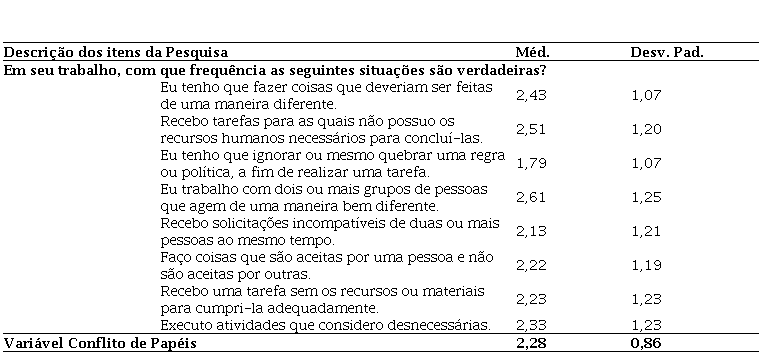 Os dados apresentados na Tabela 5 apresentam um baixo nível de conflito de papéis entre os contadores que participaram da pesquisa. Considerando a escala do tipo Likert de 5 pontos, a média de resposta para a variável foi de 2,28, com desvio padrão de 0,86. Assim, os contadores públicos pesquisados apresentam baixo nível de conflito de papéis no exercício de suas funções, resultado semelhante ao encontrado por Frazão e Wanderley (2021); isso significa que os participantes do estudo não percebem situações conflitantes no desempenho de suas atividades (Palomino & Frezatti, 2016).