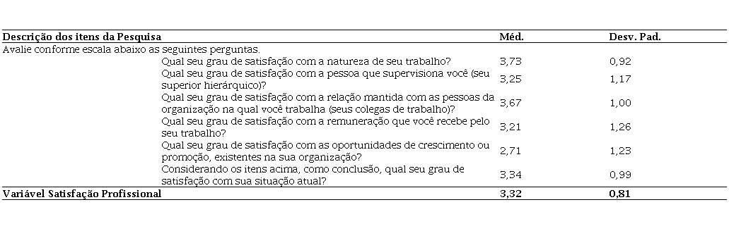 Outro fato que pode se destacar é a baixa satisfação com as oportunidades de crescimento profissional, muito diferente do resultado encontrado por Palomino e Frezatti (2016). Barbosa et al. (2016), afirmam que a carreira no setor público possui a desvantagem da impossibilidade de promoção, diferentemente do setor privado onde as oportunidades de crescimento e promoção profissional são possíveis.