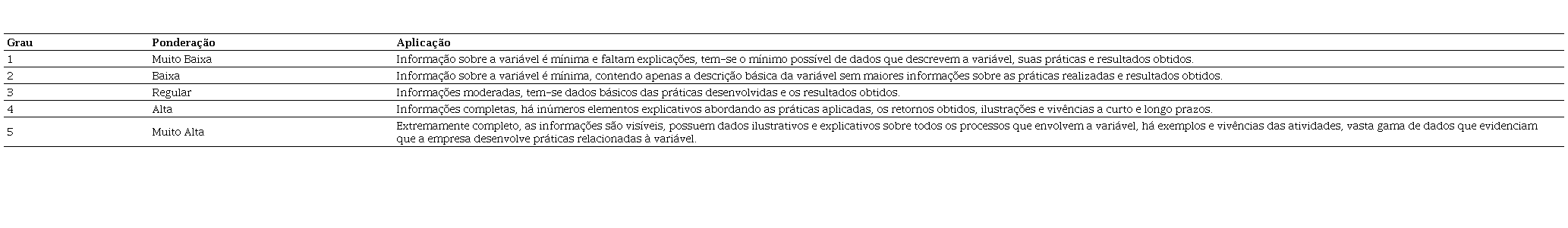 Os pontos de avaliação utilizados em cada item da escala de aplicabilidade compreenderam fatores de relevância e informação nos relatórios. Como na escala 5, de maior grau, o relatório apresenta por completo a variável em análise, demonstrando com clareza e alto grua de explicação as práticas exercidas pela organização, assim como o desempenho e consequências que estas atividades ocasionam tanto na empresa quanto na sociedade. O maior grau de aplicabilidade está relacionado à maior qualidade de informação ofertada pelo relatório.