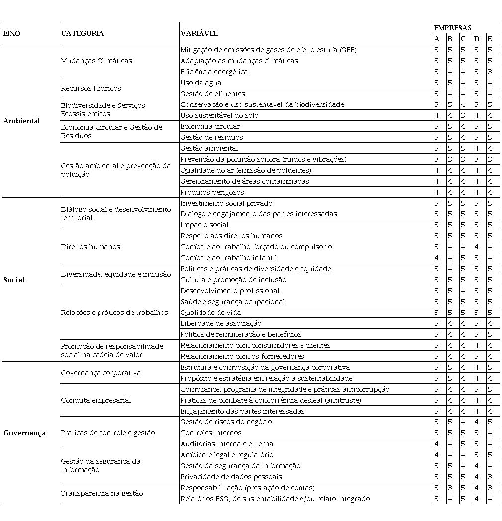 b) Utilizou-se scores para cada eixo do ESG, considerando uma escala de aplicabilidade do conceito e práticas de cada variável, de 0 a 5: 0 - Não se aplica; 1 - Muito Baixa (representa o menor grau de aplicabilidade); 2 - Baixa; 3 - Regular; 4 - Alta; e 5 - Muito Alta (o maior grau de aplicabilidade).