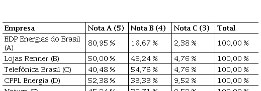 Portanto, para esta análise, foram elencados os cinco melhores índices em ordem decrescente correspondente às seguintes organizações: EDP Energias, Lojas Renner, Telefônica Brasil, CPFL Energia e Natura.