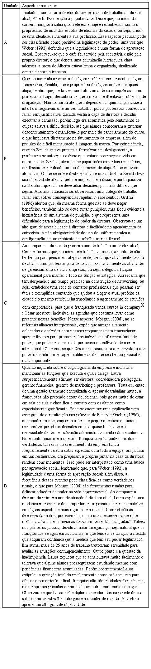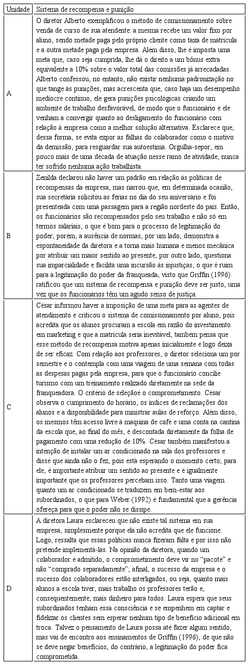 Griffin (1996) declarou que o poder está sensivelmente vinculado a um sistema de recompensa e punição. O quadro 3 explicita o modelo mental dos franqueados no que tange a esse sistema, o qual expressa uma categoria encontrada na análise das entrevistas, que contempla as ações dos empreendedores para obtenção de legitimidade no cotidiano do trabalho. Embora os estilos sejam diferentes, prevalecem as preocupações com o desempenho associado a algum tipo de benefício monetário ou psicossocial. Apenas a diretora da unidade D discorda da necessidade de agrados ou incentivos para obtenção de legitimidade.