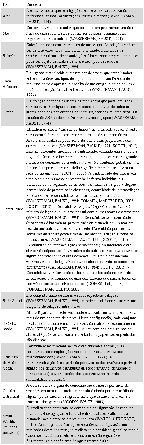Há vários aspectos na ARS que possibilitam diferentes níveis de entendimento sobre os atores em análise. Na sequência, a Tabela 1 apresenta alguns conceitos basais para o desenvolvimento de estudos em rede. Vale destacar que as definições a seguir se caracterizam como um componente voltado a agilizar o entendimento do leitor na seção de análise dos dados, o que justifica a apresentação da informação de forma concisa.