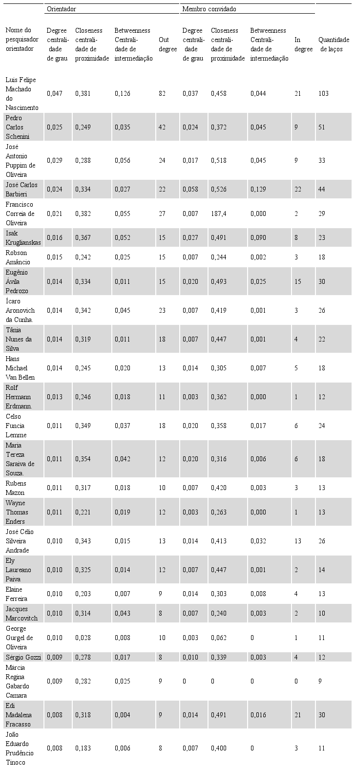 A Tabela 2 expressa na última coluna a quantidade de laços que cada pesquisador possui, integrando, dessa maneira, tanto na participação como orientador de aluno que defende a tese ou dissertação (out degree – quantidade de laços que saem do ator) quanto na condição de membro convidado (in degree – quantidade de laços de que chegam ao ator). A Tabela 2 exibe as centralidades de grau, de proximidade e de intermediação do pesquisador.