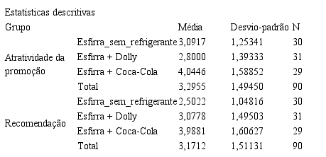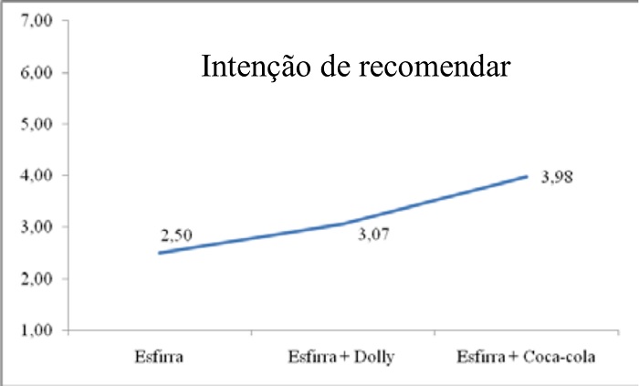 Também se acreditava que uma marca pouco reconhecida pudesse contribuir significativamente comparada à promoção apenas com o produto. Porém, não ocorreu como se esperava, ou seja, mesma que uma marca tenha certo nível de aceitação pelo mercado, mas não for uma marca muito expressiva, em termos de reconhecimento pelo mercado, tanto faz para o consumidor. Não foi identificada diferença significativa entre os grupos que avaliaram a promoção com refrigerante da marca Dolly, e os que avaliaram a promoção apenas com o produto (esfirra), refutando assim, as hipóteses h3 e h4.