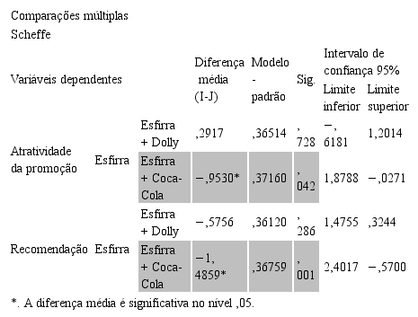 A análise dos efeitos principais apresentou os seguintes resultados: FAtratividade (2,87) = 5,730; p < 0,01; n2 = 0,113 e (FRecomendação (2,87) = 7,057; p < 0,01); n2 = 0,140). A Tabela 1 sumariza as avaliações médias dos respondentes e a Tabela 2 Test Post Hoc entre os grupos. As Gráficos 1 e 2 apresentam as avaliações dos respondentes.