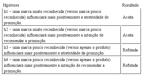 hipotetizou-se que também contribuiria positiva e significativamente para alavancar uma promoção, especificamente as feitas por varejistas de bairro. Nessa pesquisa corroboraram-se as hipóteses 1 e 2, em que se previa a influência de uma marca muito reconhecida sobre a atratividade e intenção de recomendar a promoção.