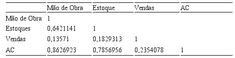 Para melhor compreensão da produtividade da Construção Civil na cidade de Santa Maria, verificou-se buscar, por meio de uma matriz de correlação, se variáveis como estoque de unidades prontas para vendas, vendas concretizadas e área construída apresentam comportamento semelhante ao da mão de obra. A Tabela 1 apresenta os valores calculados a um nível de significância de 5%.