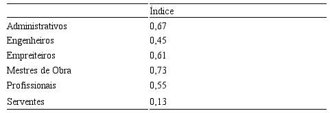 Todas as variáveis apresentaram correlação significativa, a um nível de confiança de 95%, com o índice de Produtividade do Trabalhador, com exceção da categoria serventes. Dentre as outras, a que mais apresenta correlação com o índice estudado é o mestre de obra, seguido pelos trabalhadores que exercem funções ligadas ao administrativo e então os empreiteiros. Os engenheiros e os profissionais liberais são os que menos apresentam correlação com o índice; entretanto, seus valores foram significativos na análise.