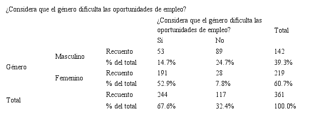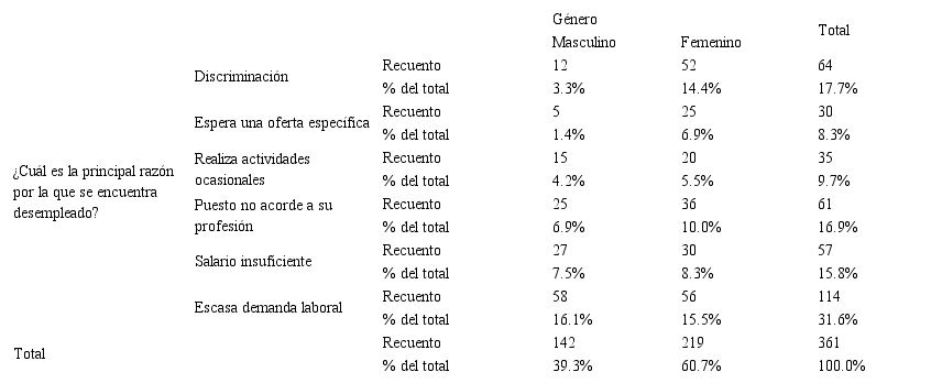 Se determina que para el género femenino la discriminación es la principal causa de desempleo debido a las estructuras sociales que aún predominan a pesar del paso del tiempo. Además, aún se considera en el mercado laboral que existen tareas o actividades específicas para hombres y mujeres.