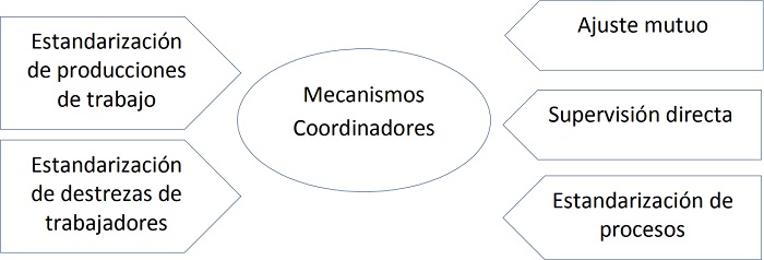 La propuesta de Mintzberg con relación a la estructura, permite estudiar, evaluar y definir cuál sería la configuración más apropiada para una organización en torno a los cinco elementos: cumbre estratégica, línea media, núcleo operativo, tecnoestructura y staff de apoyo, así mismo, resulta clave considerar aquellos mecanismos coordinadores que se constituyen en el punto de enlace de los elementos antes definidos, estos son: supervisión directa, ajuste mutuo, estandarización de producciones de trabajo, de productos y de destrezas, de modo que los medios preferidos de coordinación se podrían desplazar del ajuste mutuo a la supervisión directa o estandarización, preferiblemente de procesos de trabajo, o de producciones, o si no de destreza, volviendo finalmente al ajuste mutuo, cuando el trabajo en la organización se torna más complicado.