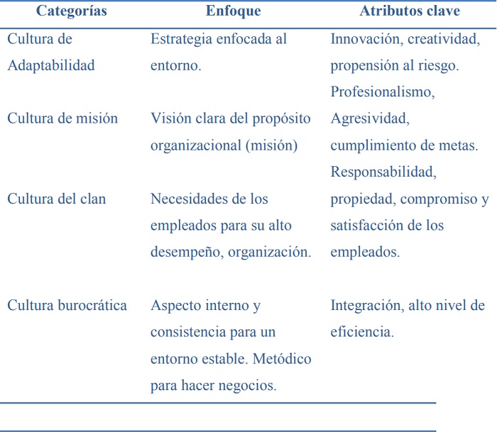 Como muestra la tabla 2, se pueden identificar en las organizaciones características atribuibles a las categorías de cultura, las cuales determinarán el enfoque o la categoría dominante que distingue a una organización de otra, considerando además el grado de acuerdo que hay entre los miembros de una organización respecto de los valores específicos.
