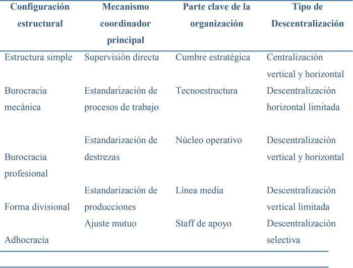 La propuesta del autor inicia con la consideración de cinco mecanismos básicos usados para lograr la coordinación entre tareas divididas, la representación visual de la organización dividida en cinco partes, los parámetros de diseño estructural principalmente la descentralización que puede tomar cinco formas básicas, factores de situación y estructura también consideradas en cinco configuraciones. En la tabla 1, se resume la relación de estos factores según Mintzberg, considerando que la mayoría de las organizaciones experimentan las cinco tendencias, sin embargo, en la medida en que las condiciones favorecen a una por encima de las otras, la organización es llevada a estructurarse como una de las configuraciones.
