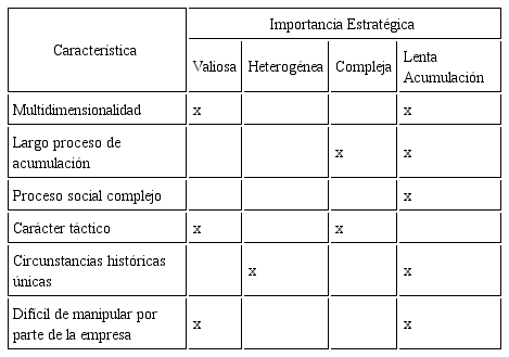 La evaluación se hace tomando como base las seis características expuestas previamente frente a su importancia estratégica con el fin de determinar si pueden ser fuente de ventaja competitiva sostenida.