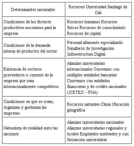 A continuación, se propone un papel central en la consecución de ventaja competitiva y brinda, al igual que en las naciones, brinda un en Porter en su libro. La tabla ayuda a plasmar los recursos existentes en la Universidad Santiago de Cali con base en los enunciados que aplican a las naciones para contribuir al entendimiento del sector competitivo de las universidades en la ciudad de Cali.