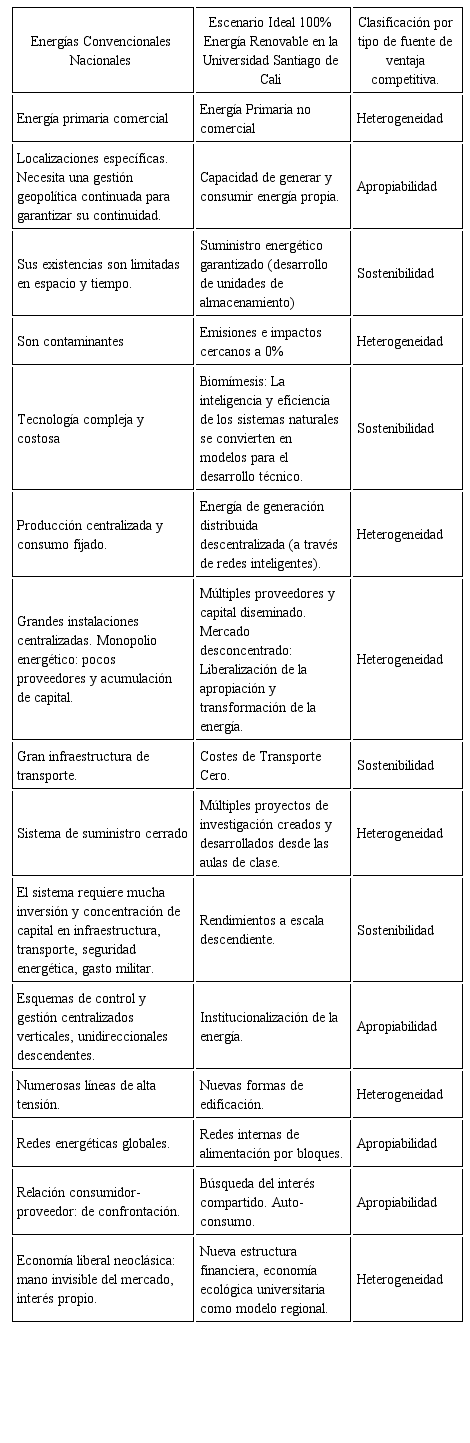La tabla anterior muestra una serie de elementos importantes que pueden ser aprovechados como fuente de ventaja competitiva porque cumplen con las condiciones necesarias. En el artículo se mencionan las condiciones de Heterogeneidad, Sostenibilidad y Apropiabilidad. En la tabla se hace un comparativo entre energías convencionales nacionales, lo que ha venido utilizando la institución para el suministro eléctrico. De la misma manera se ajustan dichas condiciones a un escenario deseable dentro del cual se vislumbra una Universidad 100% sostenible en materia de energía eléctrica.