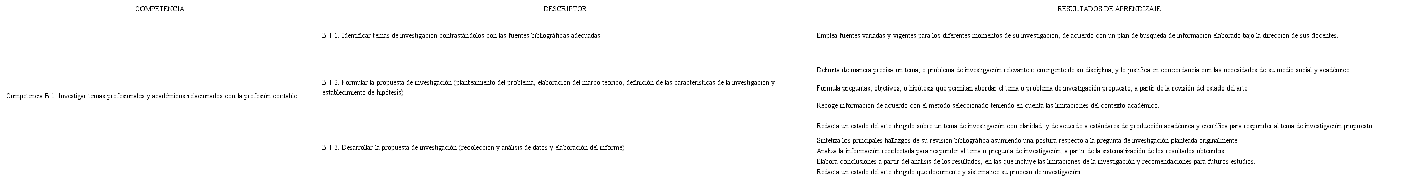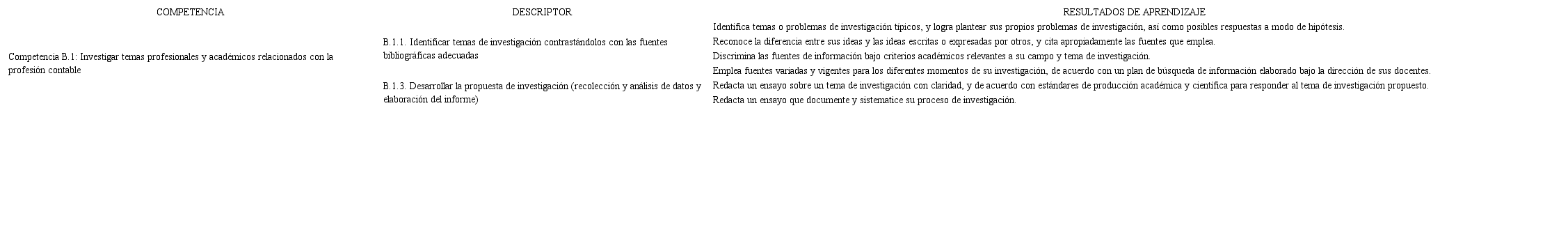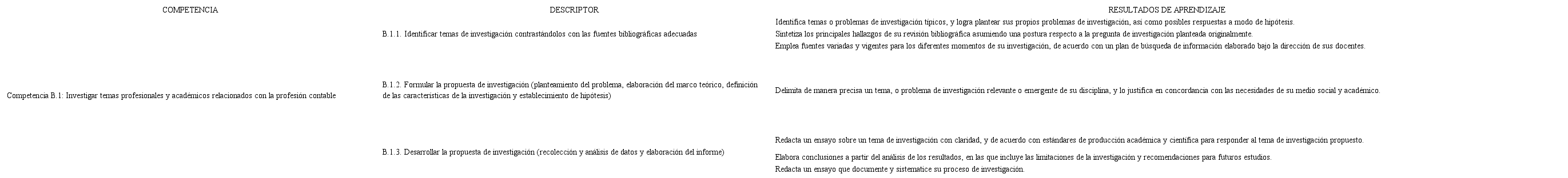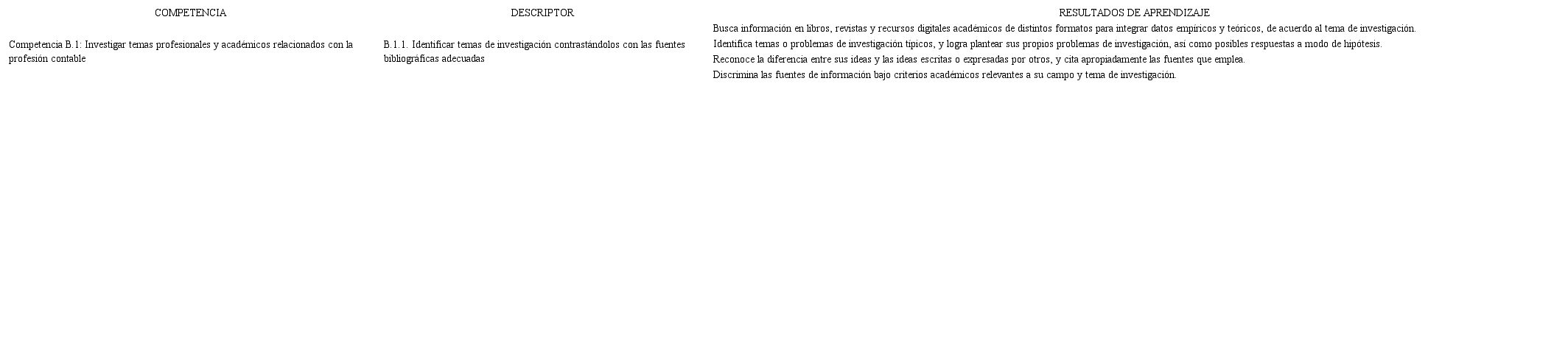 En la Facultad de Ciencias Contables, como ya se mencionó, se propone realizar un trabajo sobre la competencia genérica de investigación de manera gradual, apuntando siempre al rasgo del perfil del egresado. Por lo tanto, el trabajo que se realiza en cada curso suma al logro final, que es “Investigar de manera crítica, reflexiva y creativa, y presentar formalmente sus resultados”. Por ello y en cada curso, a través de diversos instrumentos de investigación que se describen más adelante, se ampliarán sus conocimientos sobre un tema asociado a la Contabilidad. En Estudios Generales Letras, se iniciaron los trabajos para lograr esta competencia; a partir de allí, se solicita a los docentes aplicar los siguientes instrumentos de evaluación con el objetivo de que el estudiante en décimo nivel, en el curso de Seminario de Tesis, pueda tener ya definido un campo de investigación con un marco teórico lógico y sostenible. Para cada curso, se sugiere un instrumento de evaluación para la competencia de investigación, acompañado con la rúbrica, que es la escala de valoración que se le da a cada criterio, a través de descriptores.