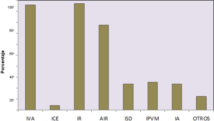 Las empresas (obligadas a llevar contabilidad), están afectas en su mayoría, o sea, el 96%, a la declaración del IVA mensual, Impuesto a la Renta y Anticipo; en menor proporción, el 24%, paga Impuesto a la Salida de Divisas. Producto de las exenciones existentes para el sector productivo, apenas el 24% es sujeto pasivo del Impuesto a la Propiedad de los vehículos motorizados, e Impuesto Ambiental.