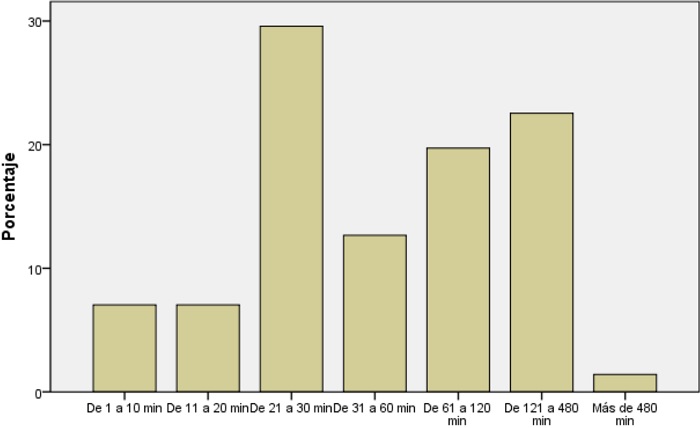 El llenado del formulario al 29.6% de la población le toma de 21 a 30 minutos, al 22,5% de 121 a 480 minutos, el 19.7% de 61 a 120 minutos, el 12.7% de la población de 31 a 60 minutos, como los porcentajes más representativos.