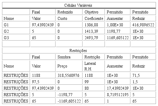 No presente estudo, não foi obtida apenas a configuração que maximiza o lucro e a utilização dos recursos, mas também dá suporte às decisões de alteração do modelo proposto se observarmos a análise de sensibilidade, pois nela podemos observar quanto de cada lote pode ser aumentado, por exemplo, o Grupo 1 pode ser aumentado em 17 lotes, o Grupo 2, em oito lotes, e o Grupo 3 em um lote mantendo-se a maximização dos recursos. A redução de cinco lotes no Grupo 2 e 65 lotes no Grupo 3. Evidenciando os limites operacionais os pontos de máxima e mínima.