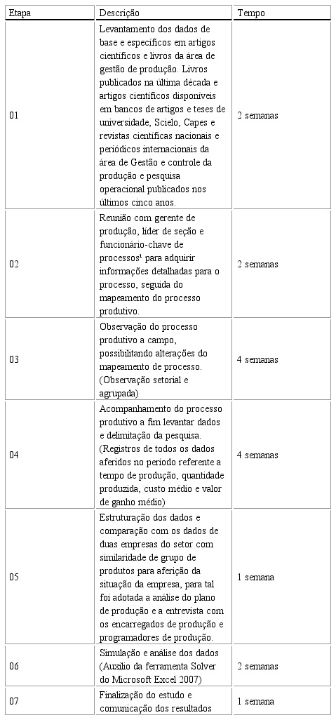 Este estudo é um estudo de caso único, o qual contemplará a análise da gestão da produção com foco na maximização dos resultados. A metodologia aplicada ao estudo conduzirá o levantamento bibliográfico de base de dados, o mapeamento dos processos, o levantamento dos dados pertinentes ao processo produtivo do período de 11/2015 a 04/2016 e a simulação dos dados com foco na redução de tempo e maximização do lucro. A sequência da pesquisa seguirá o protocolo expresso na Tabela 1.