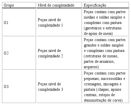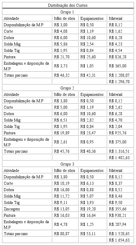 Já as peças do Grupo 3 (Tabela 5) são as peças mais complexas e que demandam maior esforço e horas para serem elaboradas, pois, por se tratarem de peças pequenas (5 a 25 cm), que exigem maior delicadeza e atenção em sua elaboração, posto que as mesmas possuem uma taxa de acidentes muito superior às das demais peças, por conta de perfurações no dedo no momento da dobra, pintura ou zincagem, fatores estes que exigem a adaptação da rotina de trabalho por conta do uso de equipamentos de prevenção individual (EPI) diferenciados, os valores foram distribuídos dentro do tempo de cada atividade que os mesmos eram demandos.