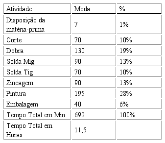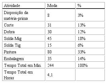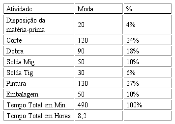 Foi aferido o tempo da produção por grupo, observando-se o tempo com maior frequência (moda). A média foi descartada, já que não expressaria a realidade por conta de existirem muitos picos de aumento no tempo e também reduções bruscas. Não foram analisadas as possibilidades de baixa produção por conta de problemas de máquinas, pois a empresa contava com um programa de manutenção preventiva. Outro ponto não contemplado foi a capacidade produtiva por colaborador e oscilação por falta de treinamento, já que, de acordo com os históricos da empresa, os mesmos contam com capacitação periódica e atualização profissional sob responsabilidade da empresa terceirizada contratada. As Tabelas 3 a 5 apresentam a moda observada, pois esse valor foi tomado como padrão, tendo em vista que a média não expressava a realidade por conta das oscilações. O melhor tempo (menor) e o pior tempo (maior) foram observados a título de comparação, mas não foram aplicados diretamente no levantamento.