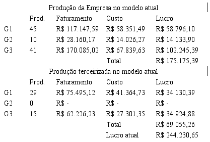 Semelhante ao ocorrido na indústria de móveis de aço indiana, objeto do estudo de Marichelvam et al. (2014), o modelo evidenciou a possibilidade de aumento da capacidade da planta em 74,4% (71 lotes) da produtividade, se comparado ao produzido pela empresa mais a produção terceirizada em 19,6% (27 lotes) e um aumento no lucro de 21,4% (R$ 52.244,50). Vale ressaltar que não houve a necessidade de descarte de investimentos financeiros, apenas o empenho de horas de trabalho.