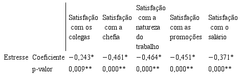Conforme demonstrado na Tabela 1, o estresse apresenta correlação negativa (i.e., quanto menor a satisfação no trabalho, maior o estresse) e significância estatística nas cinco dimensões de satisfação no trabalho: estresse e satisfação com os colegas (p = 0,009); estresse e satisfação com a chefia (p = 0,000); estresse e satisfação com a natureza do trabalho (p = 0,000); estresse e satisfação com as promoções (p = 0,000) e estresse e satisfação com o salário (p = 0,000). O nível de significância estatística adotado foi de 5%, ou seja, p-valor ≤ 0,05.