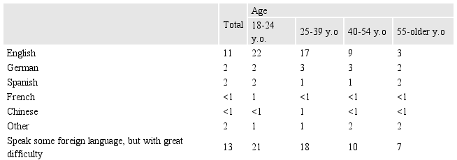 At the same time, we can see in Tables 1 and 2 that Russian population still has a very low level of foreign language skills. In the 1990s there was a reduction in foreign languages training hours in school curricula. Social, politic and economic situation changes claims the knowledge of foreign languages as a tool for everyday communication but the population is not prepared for it (USIAEVA et al., 2016) and that might have some negative psychological consequences (SHMELEV, 2015).