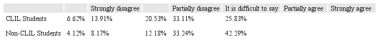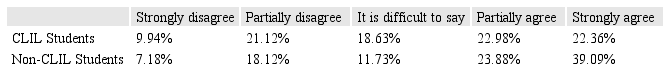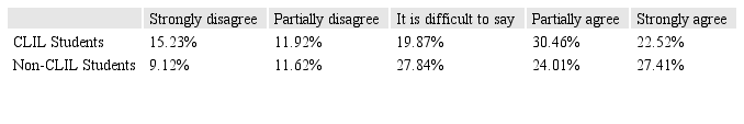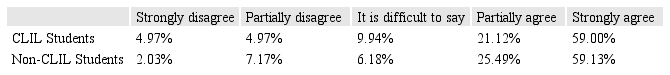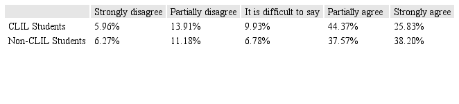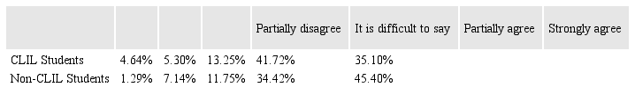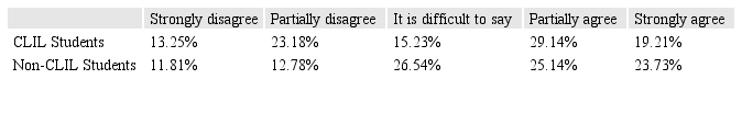 Referring to secondary school education the participants of the research support very conservative position: 80.12% of CLIL and 84.62% of non-CLIL students strongly or partially agree that public school education should be conducted in Russian and regional languages, but not in English (see Table 7). We can verify again that differences in answers between CLIL and non-CLIL students are not large.