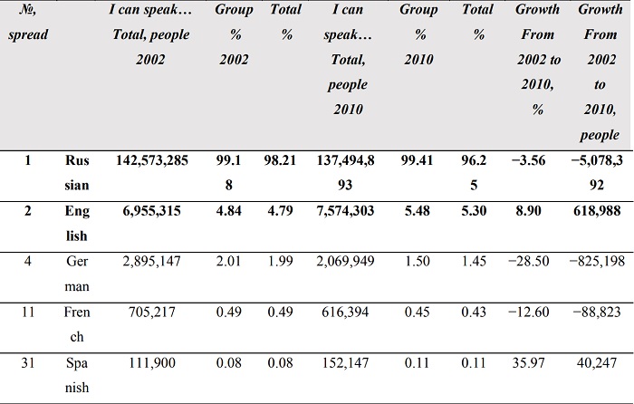 In fact, the Levada Center data looks overtly optimistic against the background of official statistics. According to the official statistics census (2010), not more than 5.48% of Russians think they can speak English. In eight years a very small success was achieved from 4.84% to 5.48% (see Table 2).