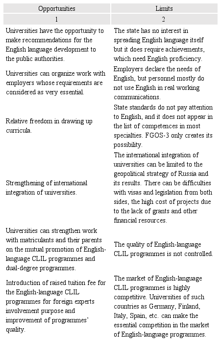 Therefore, we can draw conclusions on how the Russian language and educational policy influence bilingual programme implementation at the university level. In general, we see that serious support at the federal (state) level is impossible due to emphasis on Russian language in teaching and education. At the same time, the requirements of world university ranking cannot be done without high English proficiency. Universities can use autonomy and academic freedom, and the introduction of Content and Language Integrated Learning (CLIL) programmes can be considered as their personal choice. In Chart 1 we give a summary of opportunities and limits for adapting CLIL conception to the Russian conditions in universities (see Chart 1).
